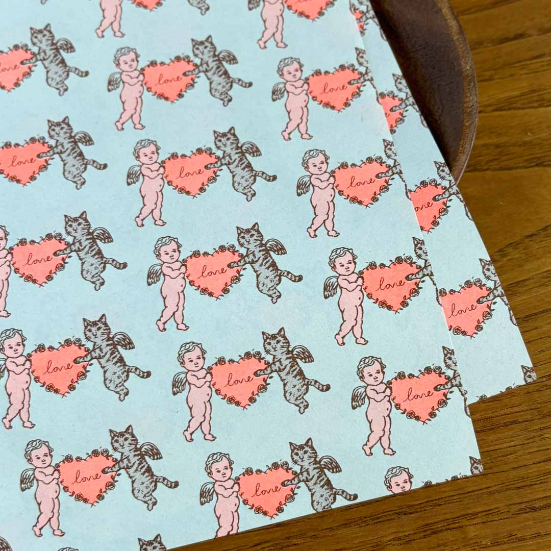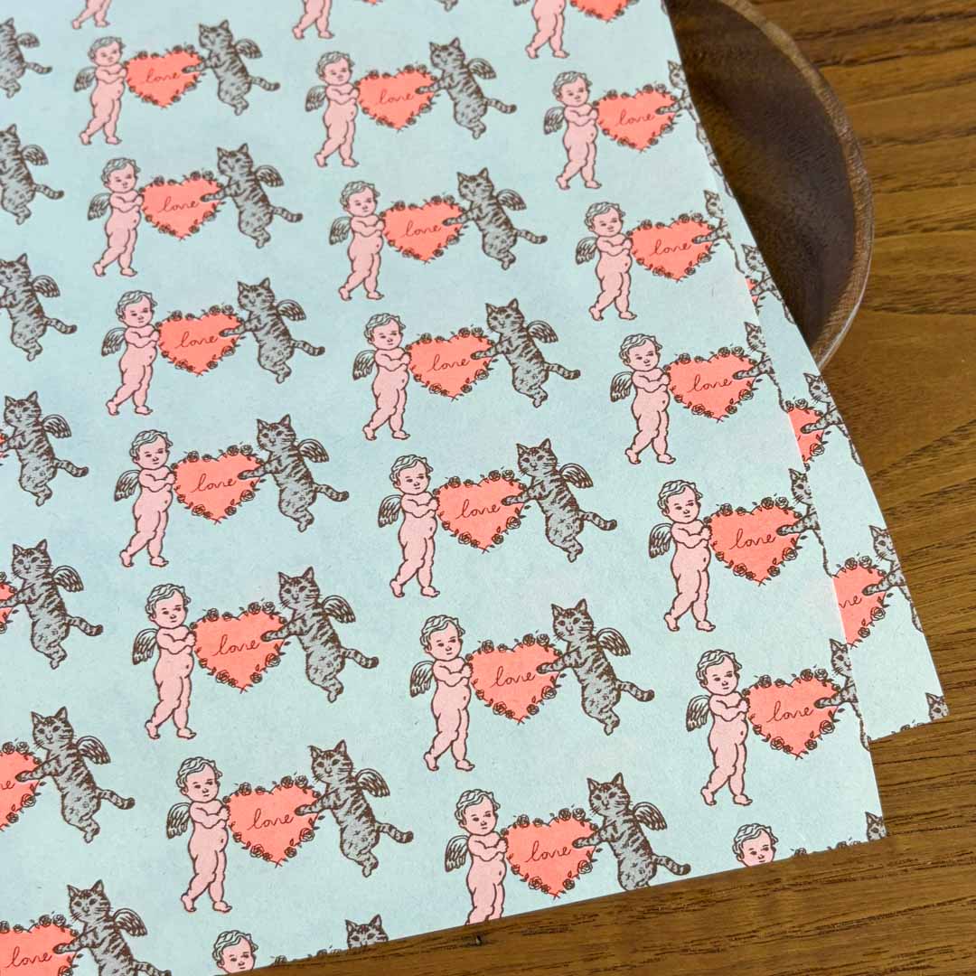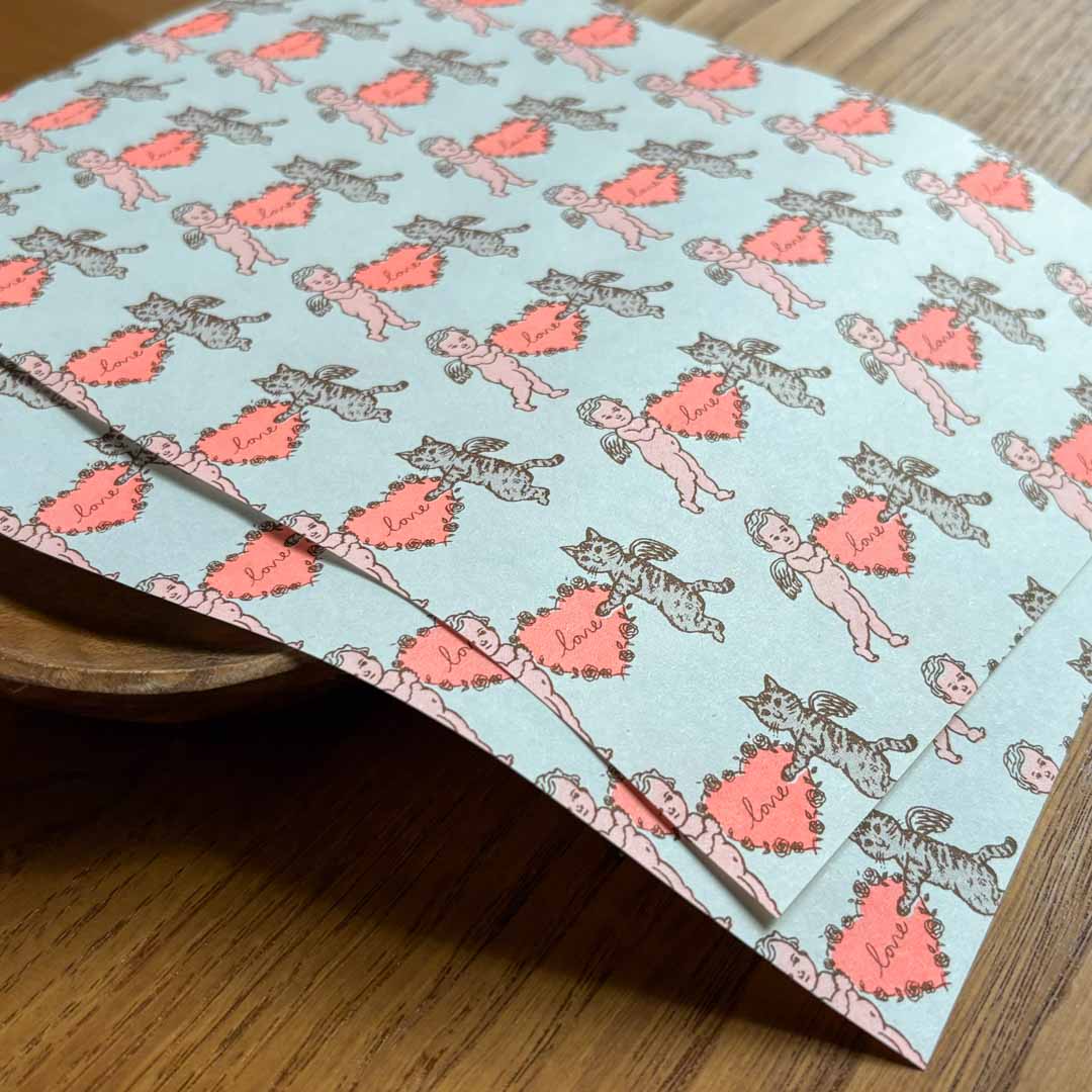 ハートを持っている猫とキューピッドのパターンを散りばめた、A4弱サイズのデザインペーパーです。蛍光オレンジの鮮やかな色味がポイント。わら半紙に孔版印刷することで、独特の風合いを引き出しています。ペーパークラフトやスクラップブッキングに使ったり、半分に切って便箋にしたり、ラッピングペーパーとしてお使いいただくのもおすすめです。