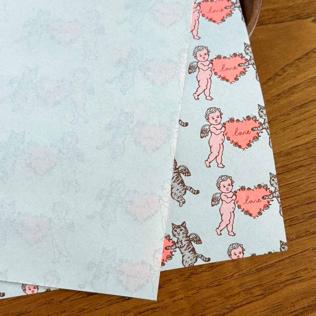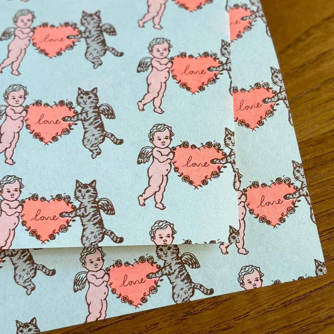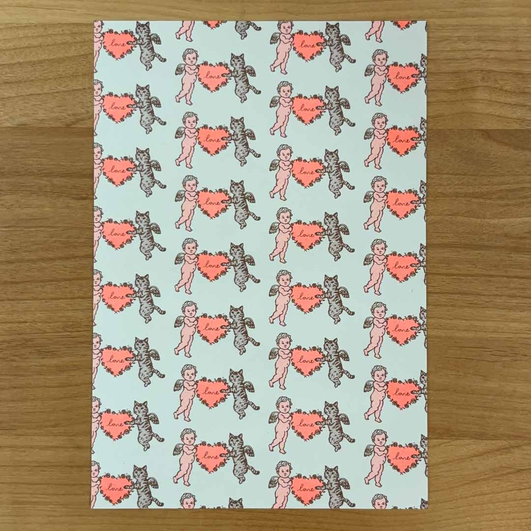 ハートを持っている猫とキューピッドのパターンを散りばめた、A4弱サイズのデザインペーパーです。蛍光オレンジの鮮やかな色味がポイント。わら半紙に孔版印刷することで、独特の風合いを引き出しています。ペーパークラフトやスクラップブッキングに使ったり、半分に切って便箋にしたり、ラッピングペーパーとしてお使いいただくのもおすすめです。
