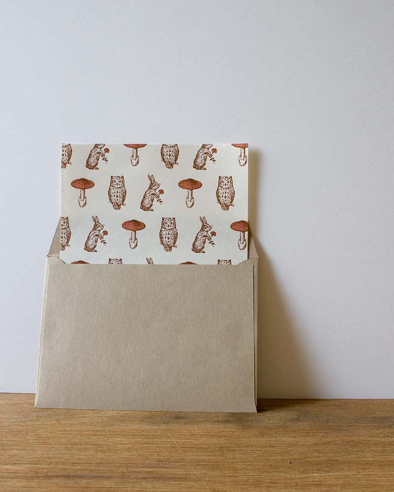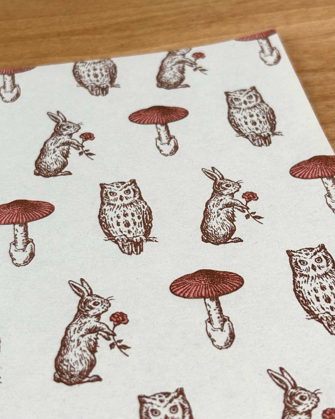 うさぎ、ふくろう、きのこ(タマゴタケ)のパターンを散りばめたレターセット。繊細なタッチが特徴です。便箋には薄手のわら半紙を使用しています。孔版印刷機で印刷することで、インクの掠れやムラが発生し、どこか懐かしい味のある仕上がりになっています。便箋の裏面は無地です。封筒にはクラフト感のある紙を使用しており、ボソボソとしたラフな手触りが特徴です。