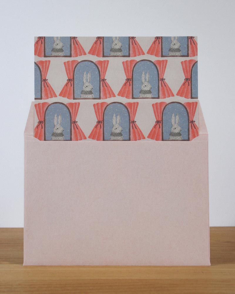 窓辺のカーテンから顔を覗かせた、ウサギのパターンを散りばめたレターセット。版画のようなかすれやムラを引き出すため、孔版印刷で原画を作成。それをナチュラルな手触りのラフ紙にオフセット印刷し直すことで、味がありつつも書きやすい便箋に仕上げています。便箋の裏面は無地。封筒はラベンダーとピンクを混ぜたような、絶妙な色合いです。