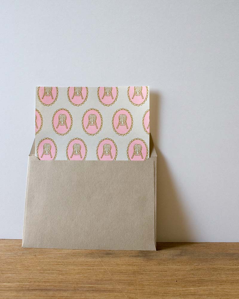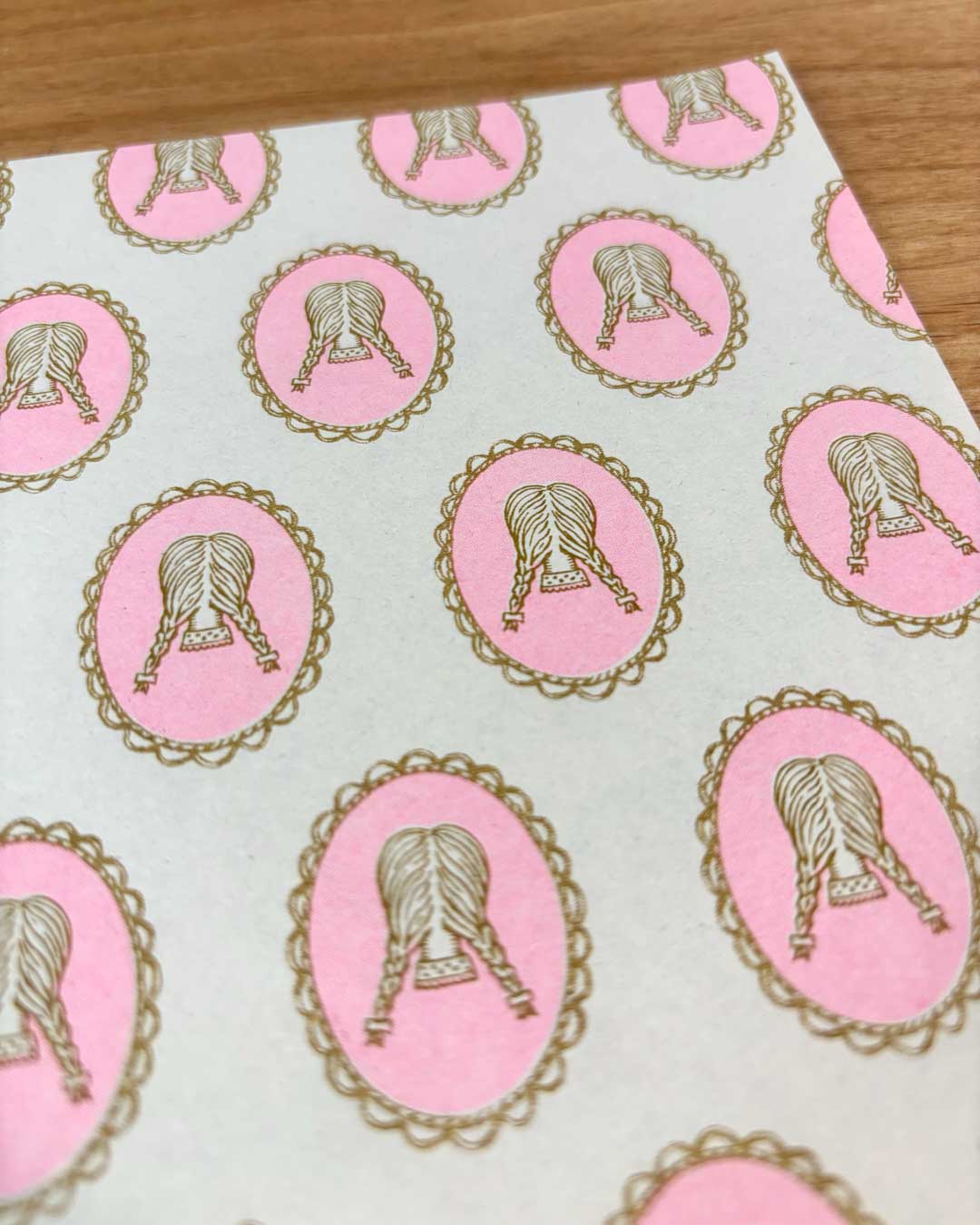 みつあみ少女のブローチを散りばめたレターセット。繊細なタッチが特徴です。便箋には薄手のわら半紙を使用しています。孔版印刷機で印刷することで、インクの掠れやムラが発生し、どこか懐かしい味のある仕上がりになっています。便箋の裏面は無地です。封筒にはクラフト感のある紙を使用しており、ボソボソとしたラフな手触りが特徴です。