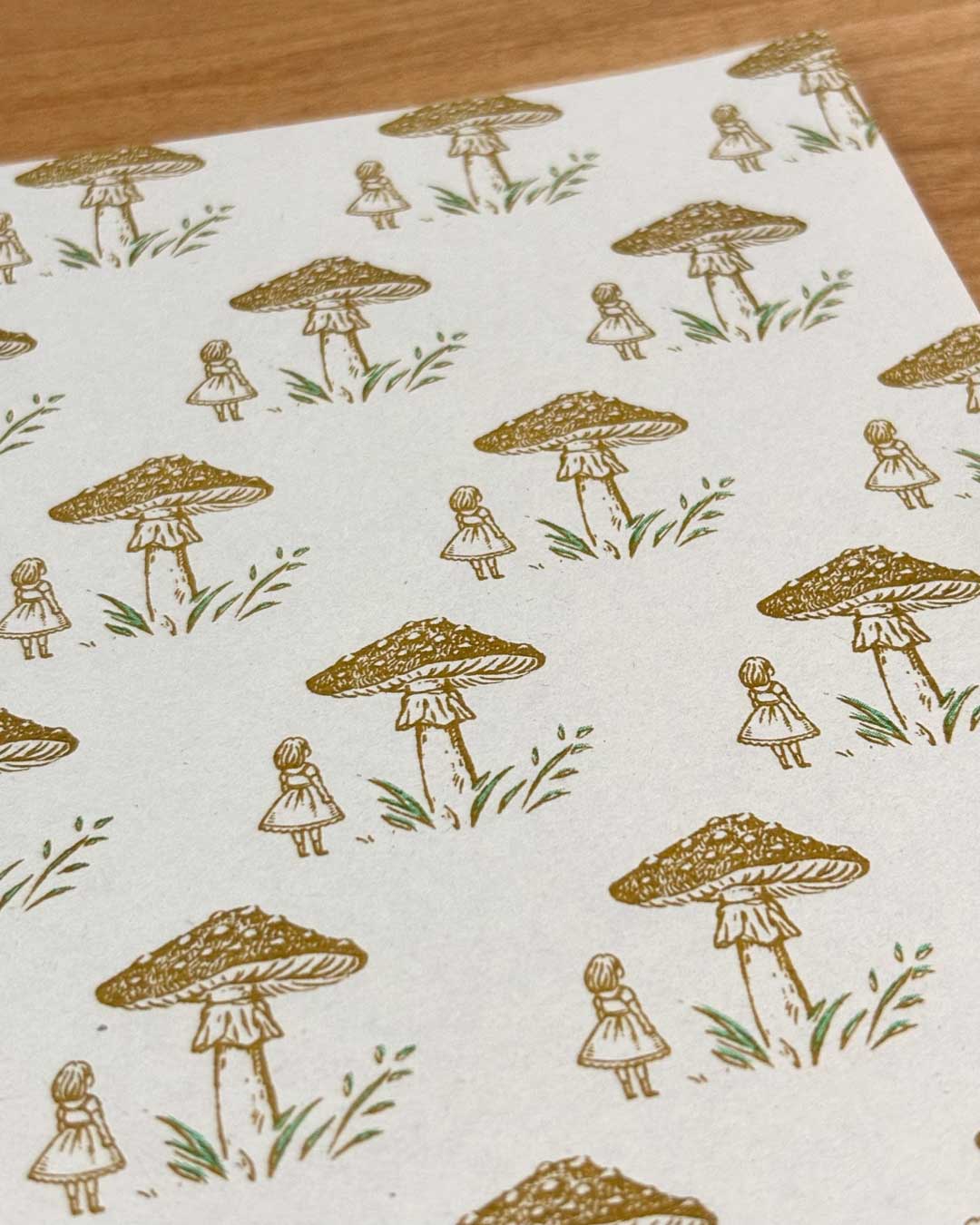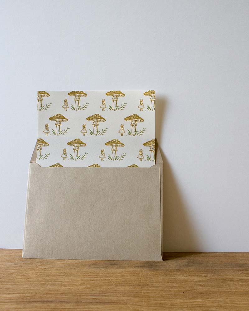 大きなベニテングタケを見上げる少女のパターンを散りばめたレターセット。繊細なタッチが特徴です。便箋には薄手のわら半紙を使用しています。孔版印刷機で印刷することで、インクの掠れやムラが発生し、どこか懐かしい味のある仕上がりになっています。便箋の裏面は無地です。封筒にはクラフト感のある紙を使用しており、ボソボソとしたラフな手触りが特徴です。