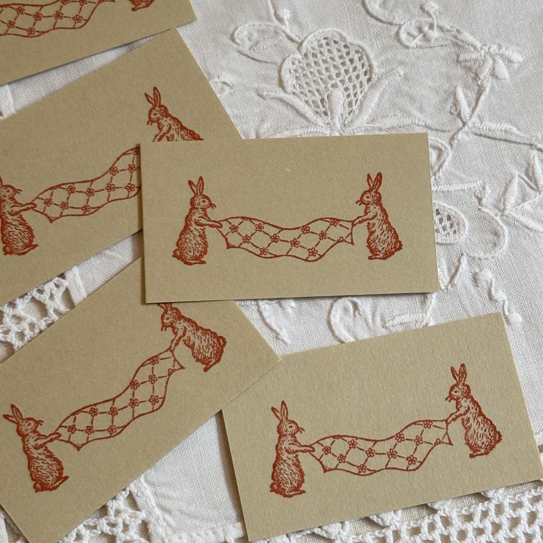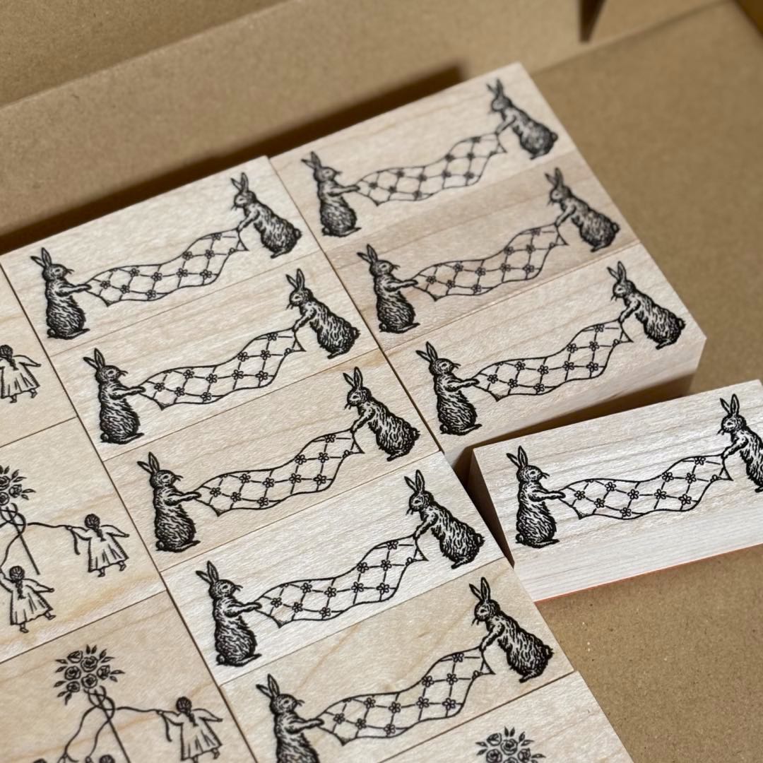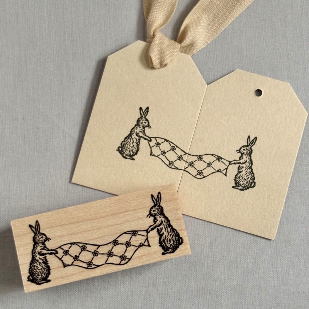 小花柄のクロスを広げて、うさぎたちがピクニックを始めようとしている場面をスタンプにしました。うさぎたちがクロスを広げれば、どこでもピクニック場に早変わり。クロスの上の空白部分に、文字のスタンプを組み合わせても素敵です。