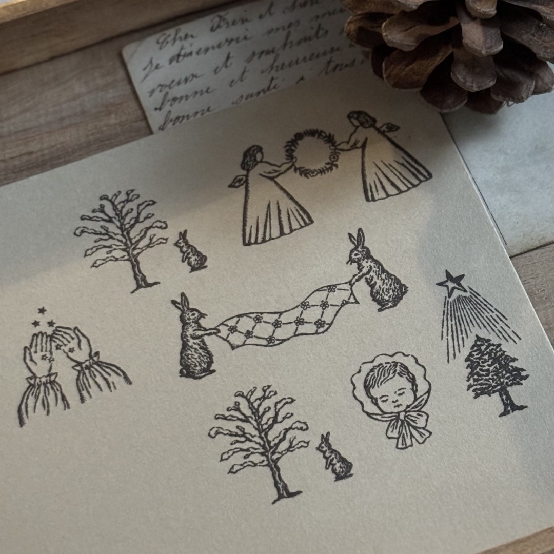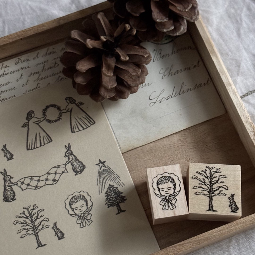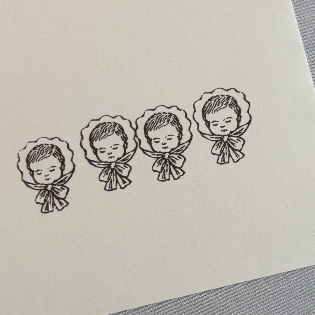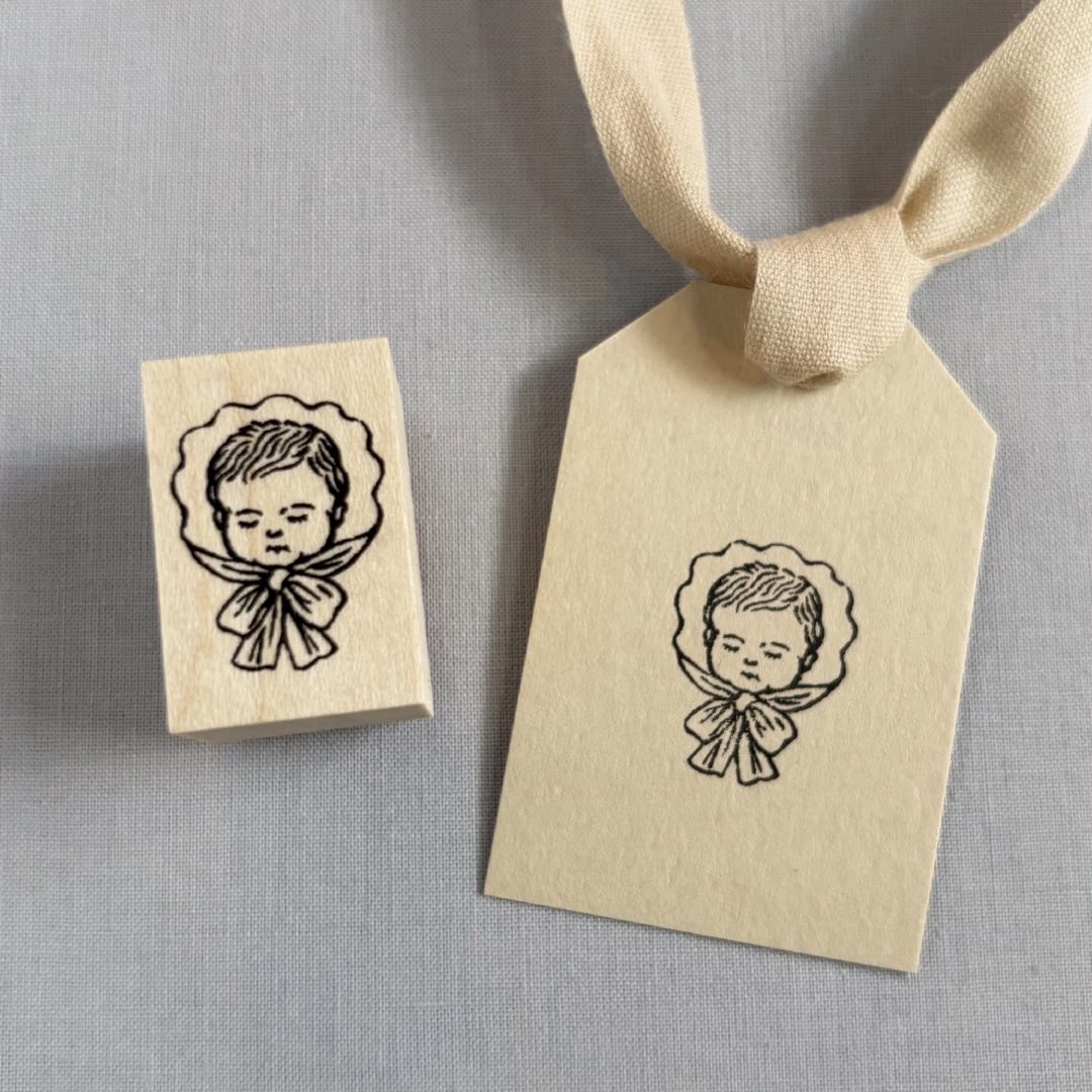 赤ちゃんが眠っている様子を描いたスタンプです。かわいいリボンのおくるみを着た赤ちゃんは、どんな夢を見ているのでしょう。少しカールした髪の毛、まつ毛、大きなリボンがポイントです。天使やイエス様モチーフとして、クリスマスの雰囲気作りにもおすすめです。