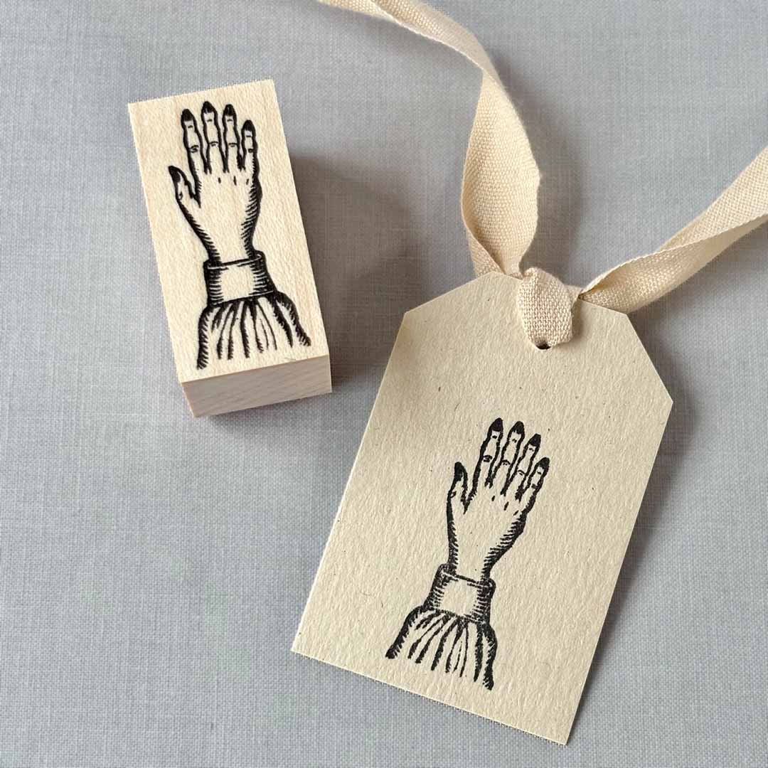手をモチーフにしたスタンプです。ブラウスの袖がたわんで美しいドレープができています。tales on the deskのスタンプは、線画のイラストの細かい部分まで再現できるように、原画に調整を重ねています。ペーパークラフトやスクラップブッキング、お手紙のアクセントにもおすすめです。単品での販売となります。