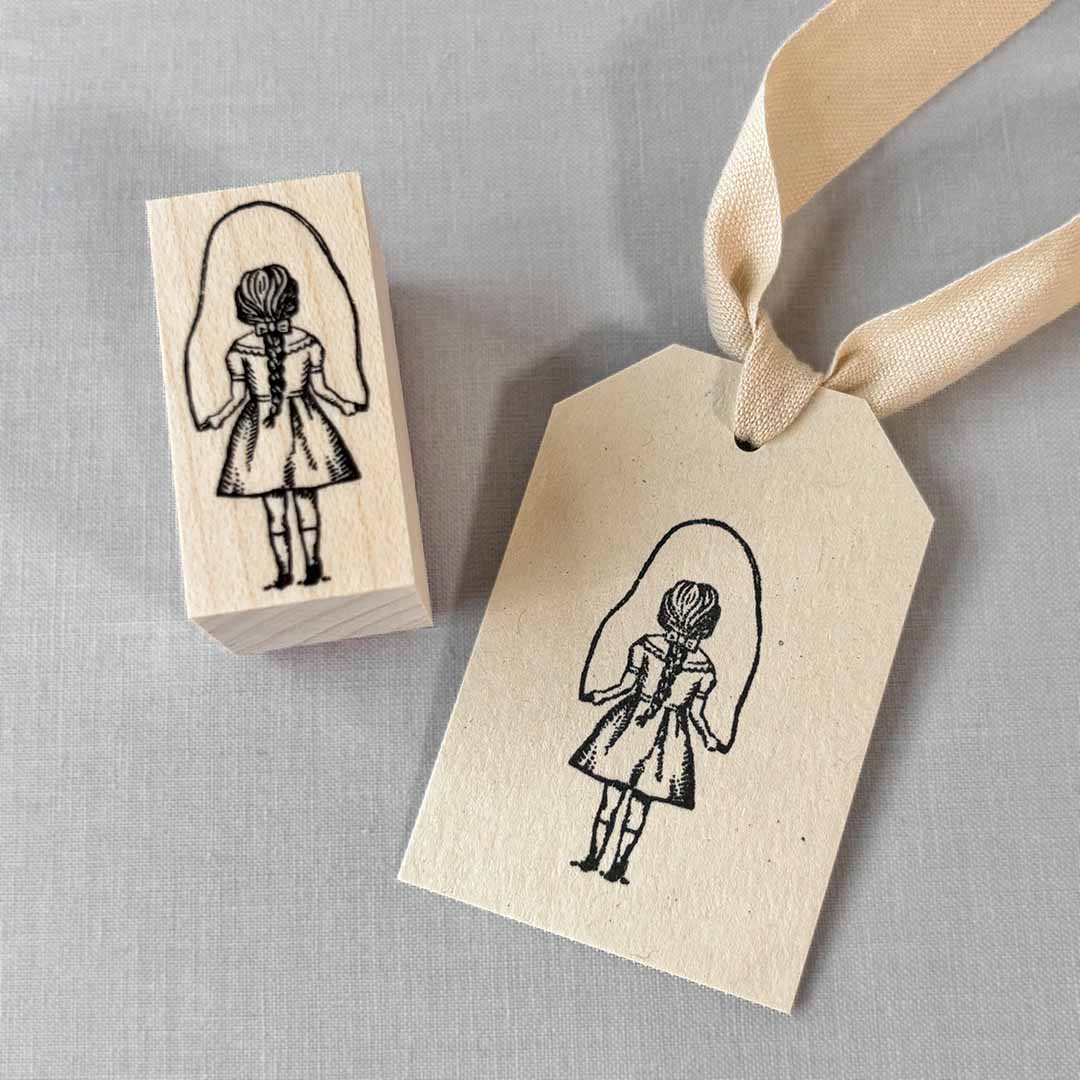 女の子の後ろ姿を描いたスタンプ。童話の中から飛び出したような長い三つ編みの女の子が、縄跳びをして遊んでいます。tales on the deskのスタンプは、線画のイラストの細かい部分まで再現できるように、原画に調整を重ねています。ペーパークラフトやスクラップブッキング、お手紙のアクセントにもおすすめです。単品での販売となります。
