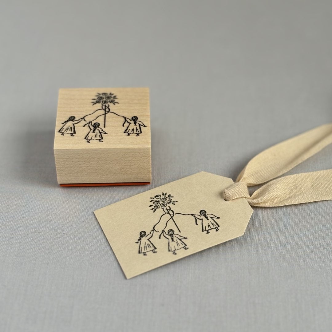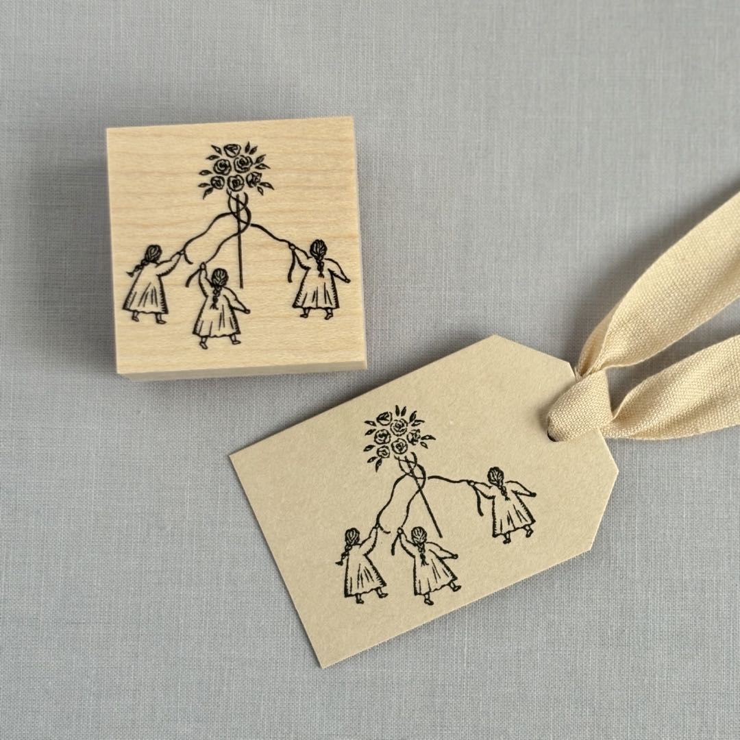 メイポールダンスを踊る3人の女の子を描いたスタンプです。メイポールダンスは、ヨーロッパのメイデイ(五月祭)に春の訪れを祝って踊られるダンスで、音楽に合わせリボンを編み上げていきます。薔薇のお花と少女たちのドレス、三つ編み、リボンのたわみなど、女の子らしい要素をたくさん詰め込みました。繊細な絵柄をお楽しみください。