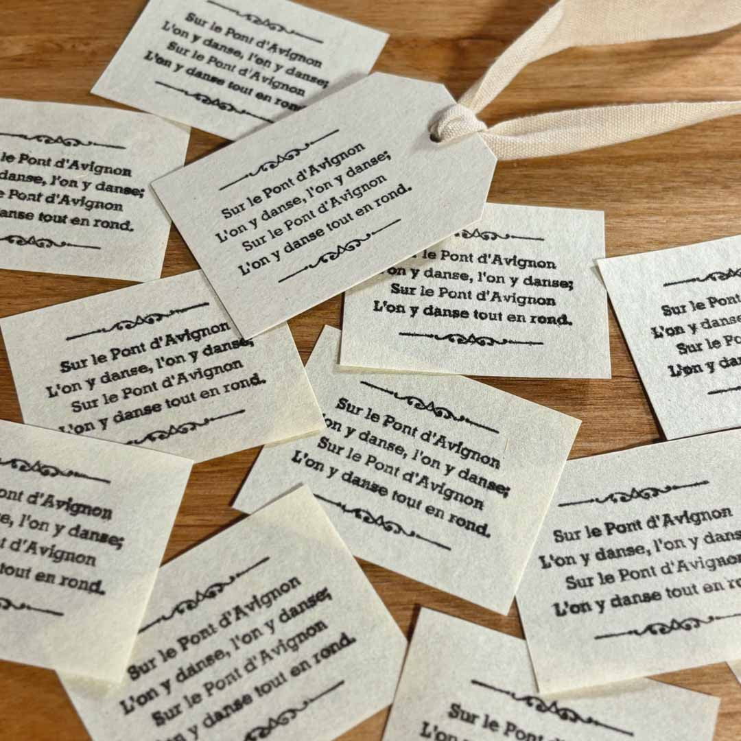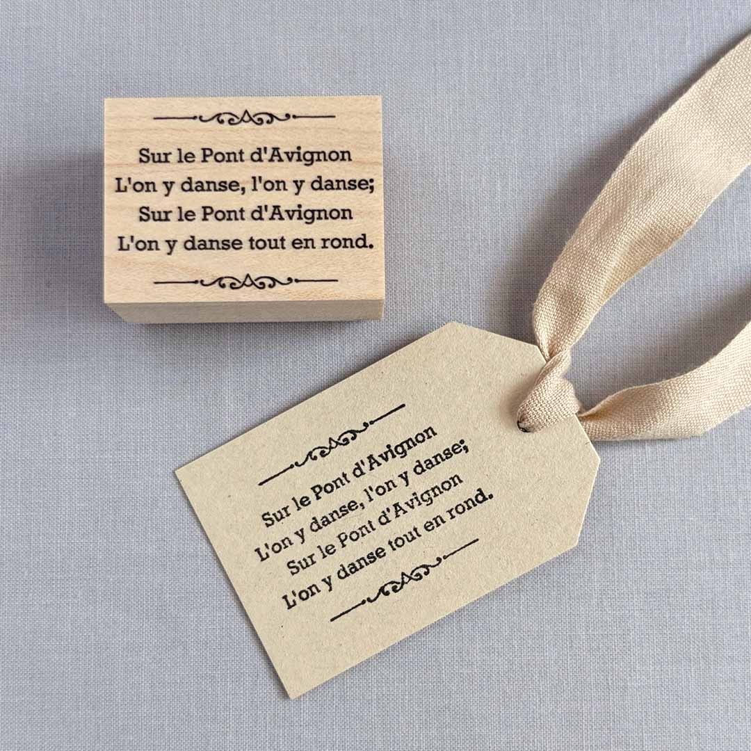 フランスに15世紀から伝わる民謡「Sur le Pont d'Avignon」の詩をモチーフにしたスタンプです。古典的な書体とアンティーク調の飾り線がポイント。イラストのスタンプと組み合わせたり、小さなカードに捺してアンティークラベルのようにしたり、ひとつ持っているだけで色々な使い方が楽しめます。ペーパークラフトやスクラップブッキング、お手紙のアクセントにもおすすめです。単品での販売となります。