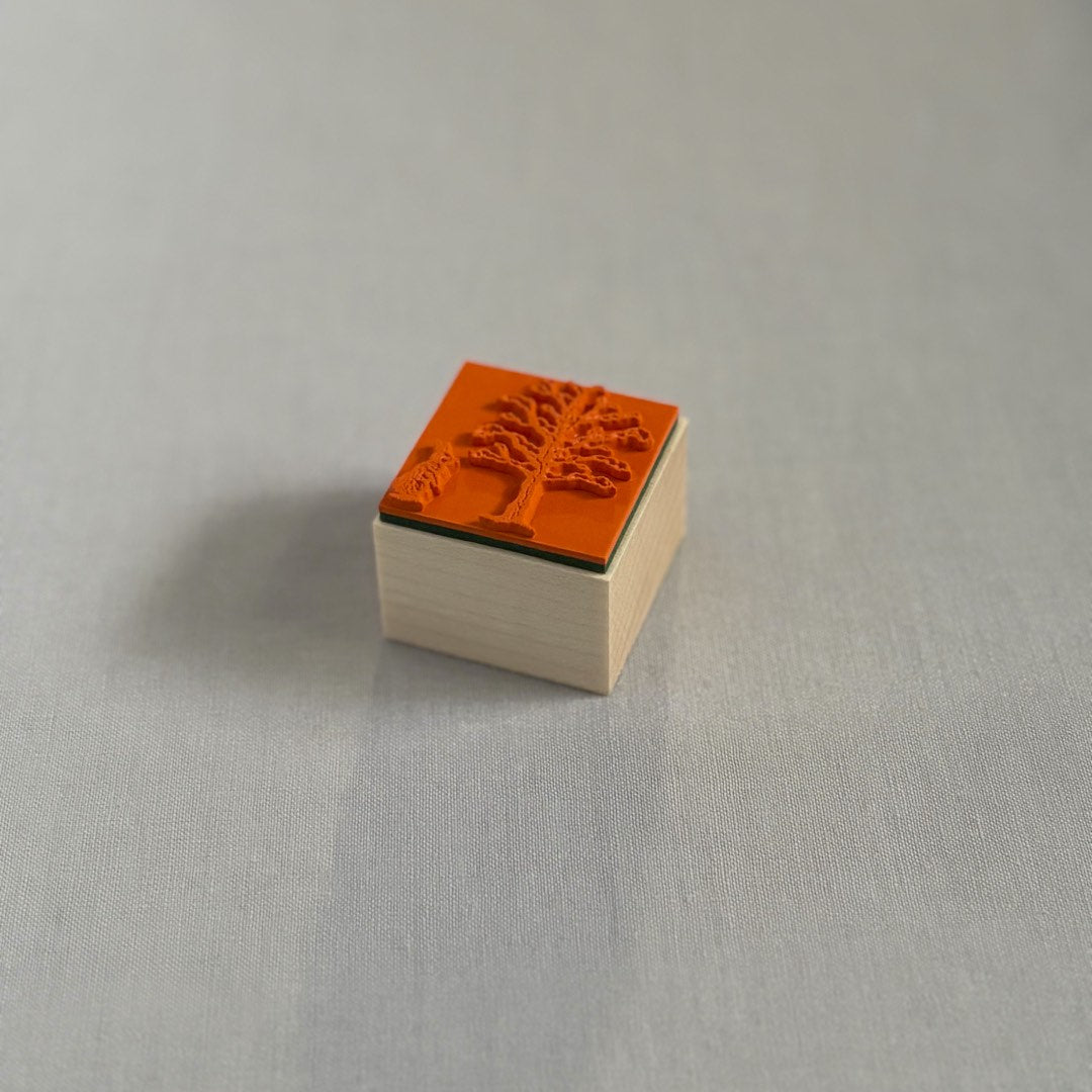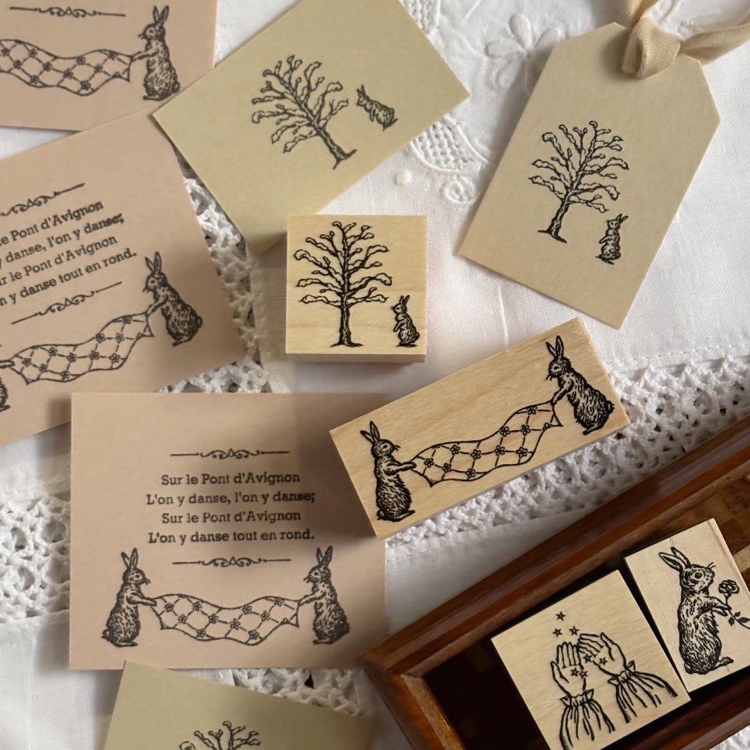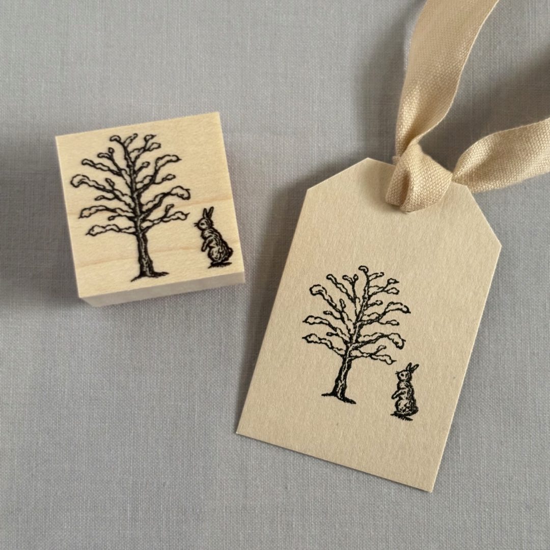 冬枯れの木に雪が積もっている情景を描きました。静かな冬の朝、真っ白な雪が積もった木を見に来ているのは、小さなうさぎです。クリスマスやお正月をはじめ、冬にぴったりのスタンプができました。